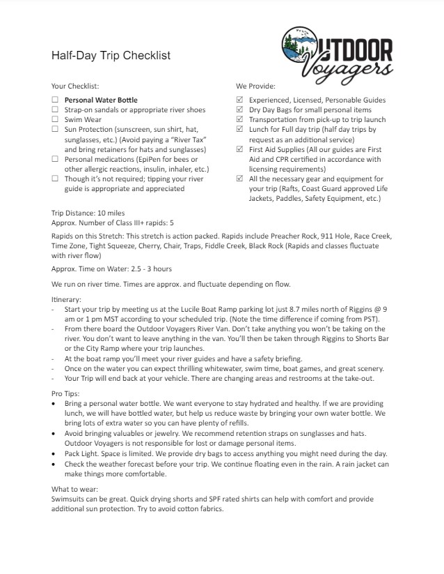 This float takes approximately 3 hours depending on the river flow. Plan to meet at the Lucille Recreation Site (boat ramp) parking lot at either 9 am or 1:30 pm mountain time (8 am or 12:30 am PST) depending on the time you book (please note the time difference, especially if you are coming from pacific time). From there you will board the Outdoor Voyagers shuttle and be taken to Riggins where your trip will launch. There you will meet your river guides and after a safety briefing, you’ll push off.
